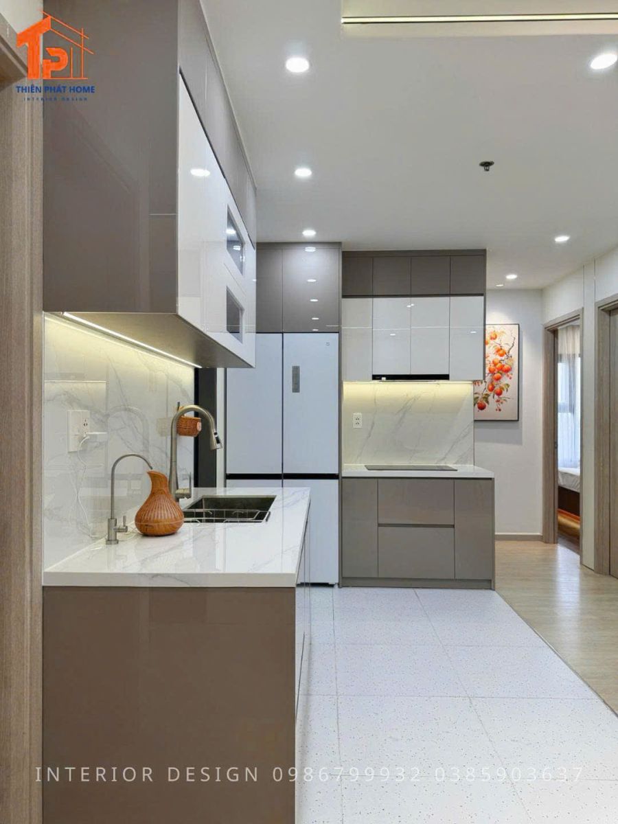 Khu bếp của căn hộ này được thiết kế theo dạng bếp chữ I và có bàn đảo. Thiên Phát Home đã thiết kế lại bố cục của căn bếp, giúp tăng diện tích cho phòng khách và tăng thẩm mỹ cao.