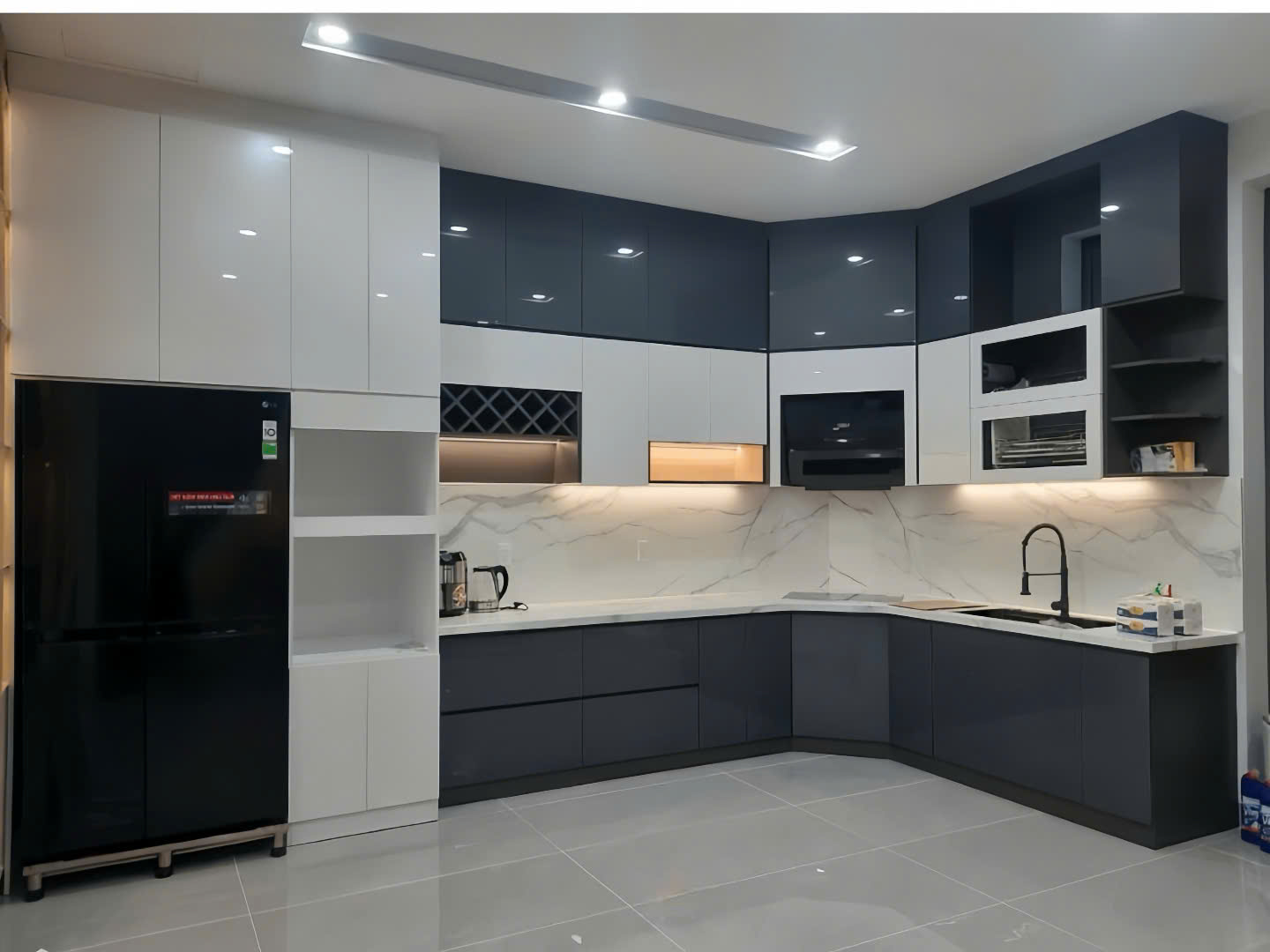 Khoang tủ thiết bị âm: Bố trí lò nướng, máy rửa bát, và máy hút mùi gọn gàng, tạo sự đồng bộ và hiện đại.